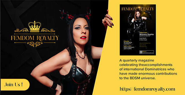 In Femdom Royalty, Lady Bellatrix has forged not just a magazine, but a manifesto for the future of Female Domination, bursting with substance that educates as it arouses, this quarterly gem is indispensable for Dominas, kinksters, fetishists, and subs alike.
