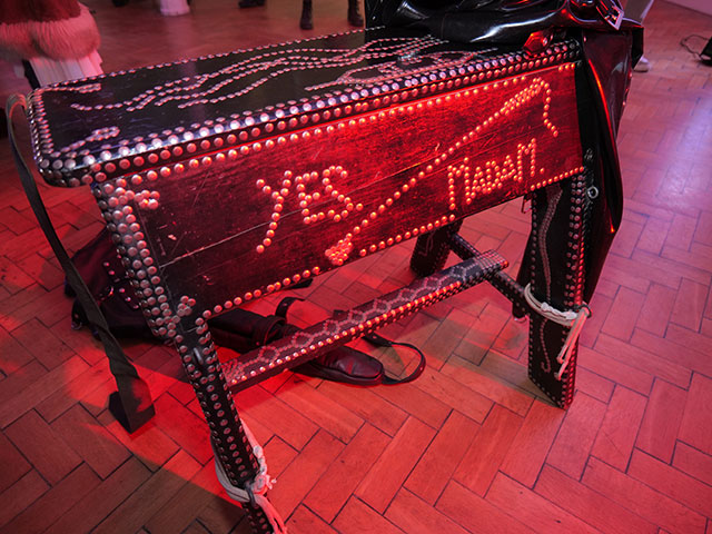 Upstairs in The Exhibition Space – titled Transformation, contemporary fetish makers like Wrapped in Rubber displayed works alongside archive pieces, with the artist and live sculpture/performer Electric Adam. My personal favorite was the wonderful latex inflatable ‘uddered’ donkey. Dominatrix Miss May performed a striking kinky scene with her sub.