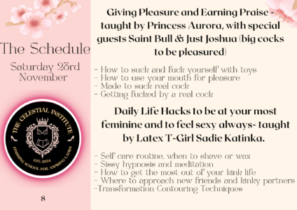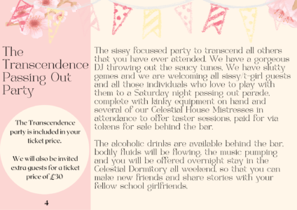 The Celestial Institute was devised by Goddess Vivienne, who had a burning desire to open a top class Xdressing & Feminisation fetish school. This has been realised in a weekend programme. A unique event to live out their kinkiest, sluttiest fantasies in a safe and custom built fetish environment, Celestial Studios. Equipped with 10 play spaces to cater for all kinky lessons for sissy sluts and gorgeous t-girls. Celebrated with a kinky passing-out party on the Sat evening for our freshly debouched débutantes.