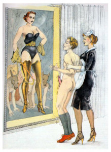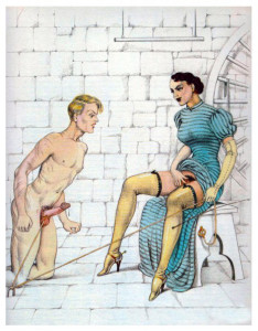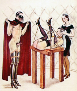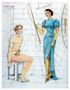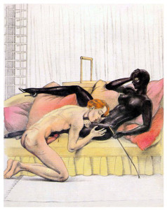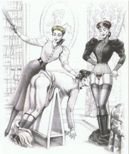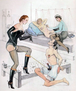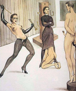 The illustrations are simple, somewhat crude pencil drawings of slender female and male figures engaged in extreme BDSM play. CP and sex acts, some brought to life with rather gaudy watercolours. They pretty much cover the gamut of female domination ‘activities’ with some homo-erotic/male bi dom and enforced feminisation thrown in. The backgrounds are usually domestic and rather refined, set in upper-class bourgeois drawing rooms (though there are dungeon scenes). The women are elegant and haughty while the men are younger and rather delicate.